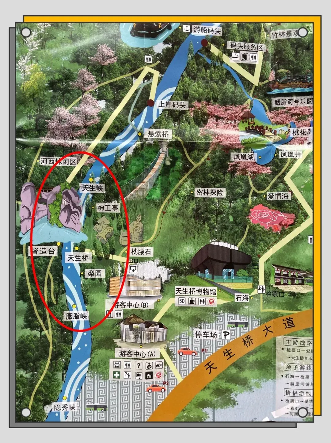 如上导游图左边红色椭圆标示区域,是咱重点游览目标。此番游园的文旅融合诉求指向于名胜胭脂河和天生桥(省级文保单位)。园内的游乐设施不少,但均非咱所好;只是走过路过,不可错过,看一眼而已,照个相,打个卡——
