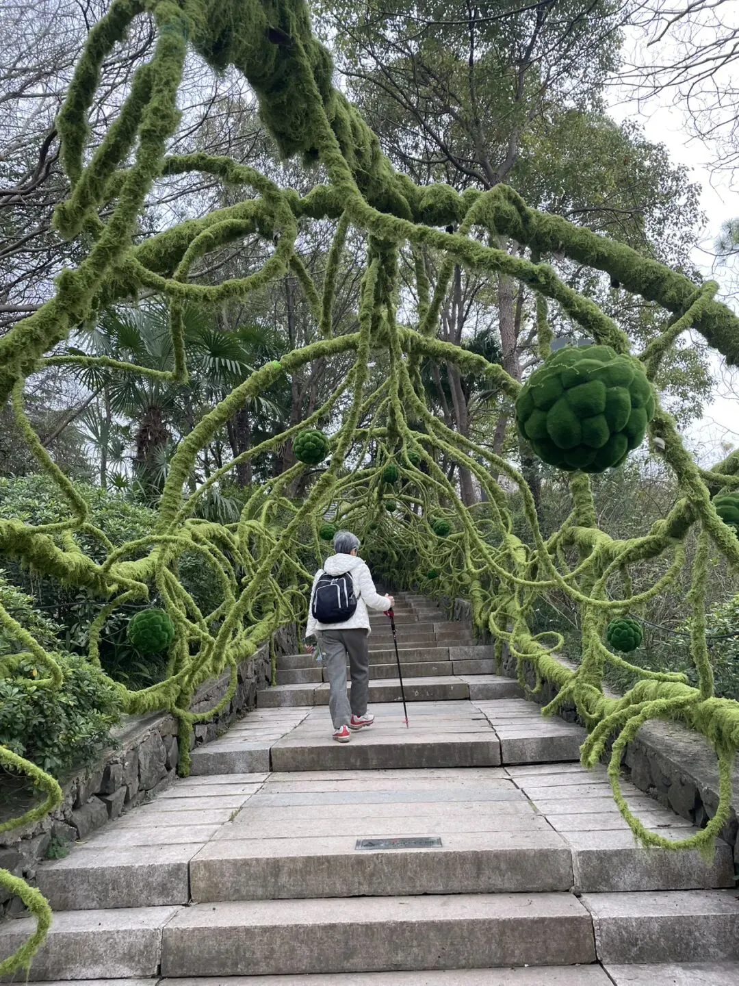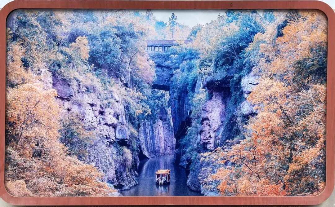 “天堑探险桥”悬挂于胭脂河上,与天生桥遥相呼应,是一种集游乐、代步于一体的富有刺激性的高空挑战项目,同时又能将天生桥、胭脂河美景尽收眼底,好似在美景里畅游。桥全程长65米,宽2米,高20余米,是由彩色木板与彩色玻璃交替布置组成的隔空步道,宛如一道彩虹横跨胭脂河两岸。漫步高空,一步惊心,步步惊心!其强烈的色彩冲击、惊险刺激的感官感受,每走一步都是对自己无限勇气的激发,让人真正体验到步履凌空的心惊胆战。下图天生桥头立的石碑,上书大字——天雨汇集胭脂河,鬼斧神工天生桥。我在此碑前留影——然后,沿如下人工创设的绿藤廊道上坡,在景区出口处左拐,奔博物馆而去了——博物馆造得很气派,展陈内容相当丰富;然而,至少在我入内参观时,几成包场,不禁让人感叹。工作人员热忱指点我,电梯直上三楼。内里分若干主题展厅,我沉浸其中,观览十分入神,不亦乐乎。先上几张现场图,待日后有空再作专题记叙。