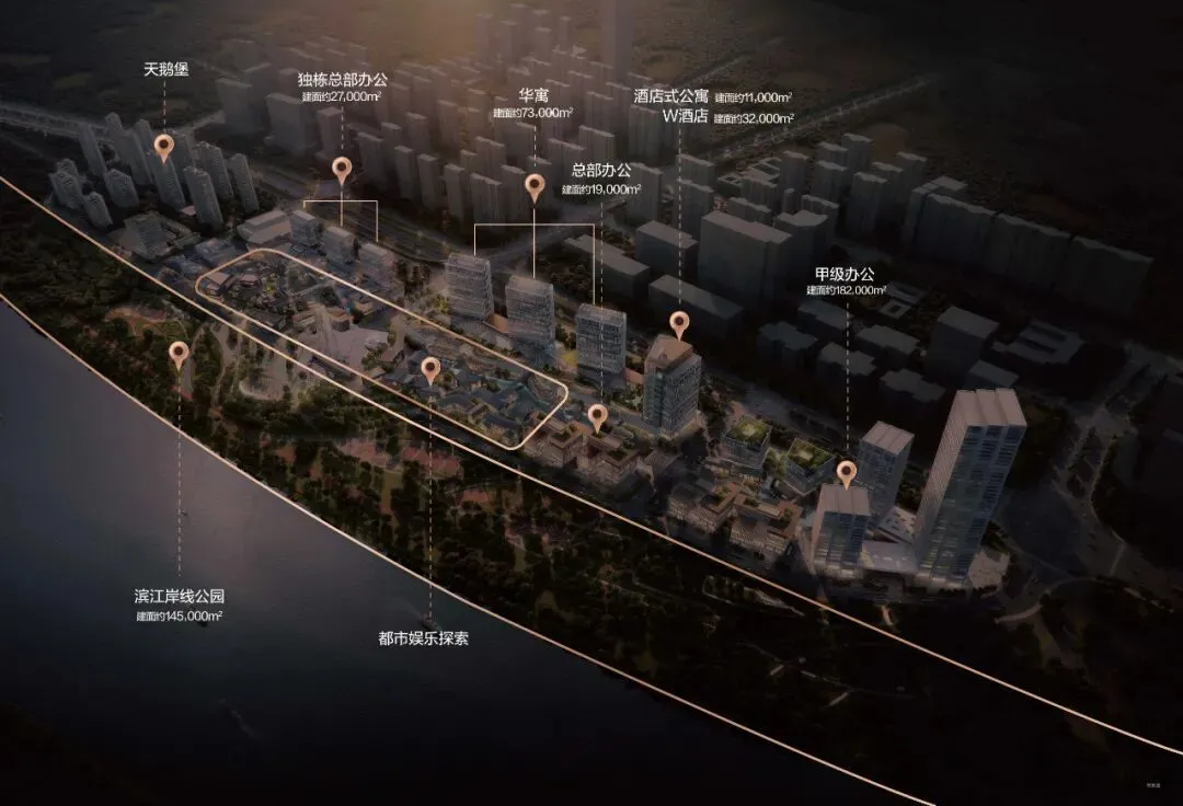 项目总投资近250亿元,占地50万㎡,总建筑面积112万㎡,沿江岸打造1.8公里滨江岸线公园。整体业态非常丰富,包括: