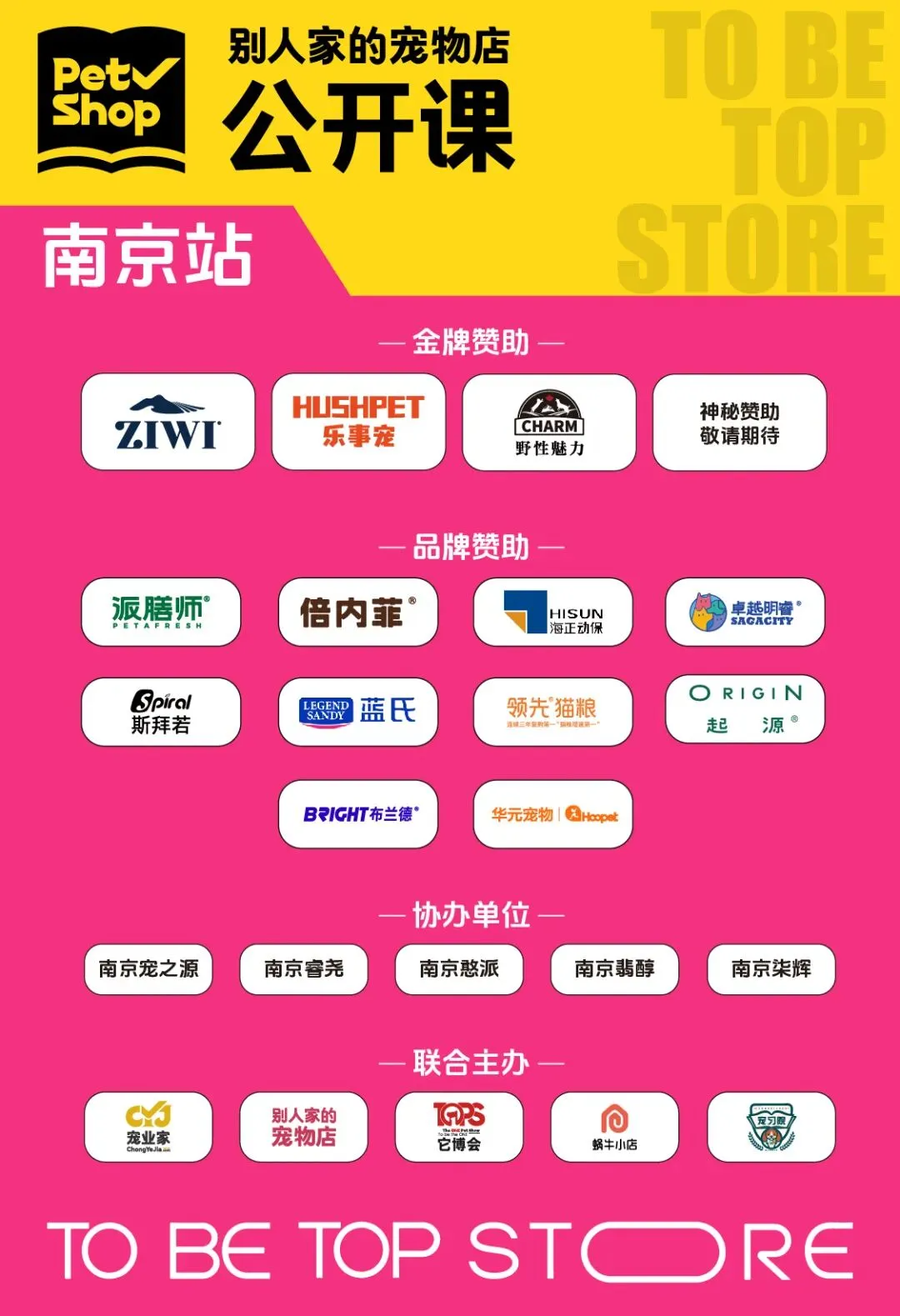 本次南京站公开课特别感谢本地经销商、代理商鼎力协办,携手打造高质量宠业交流学习平台;同时感谢ZIWI巅峰、乐事宠、野性魅力、派膳师、倍内菲、斯拜若、领先、卓越明睿、布兰德、华元宠物、蓝氏、海正动保、起源等品牌的联合赞助!
