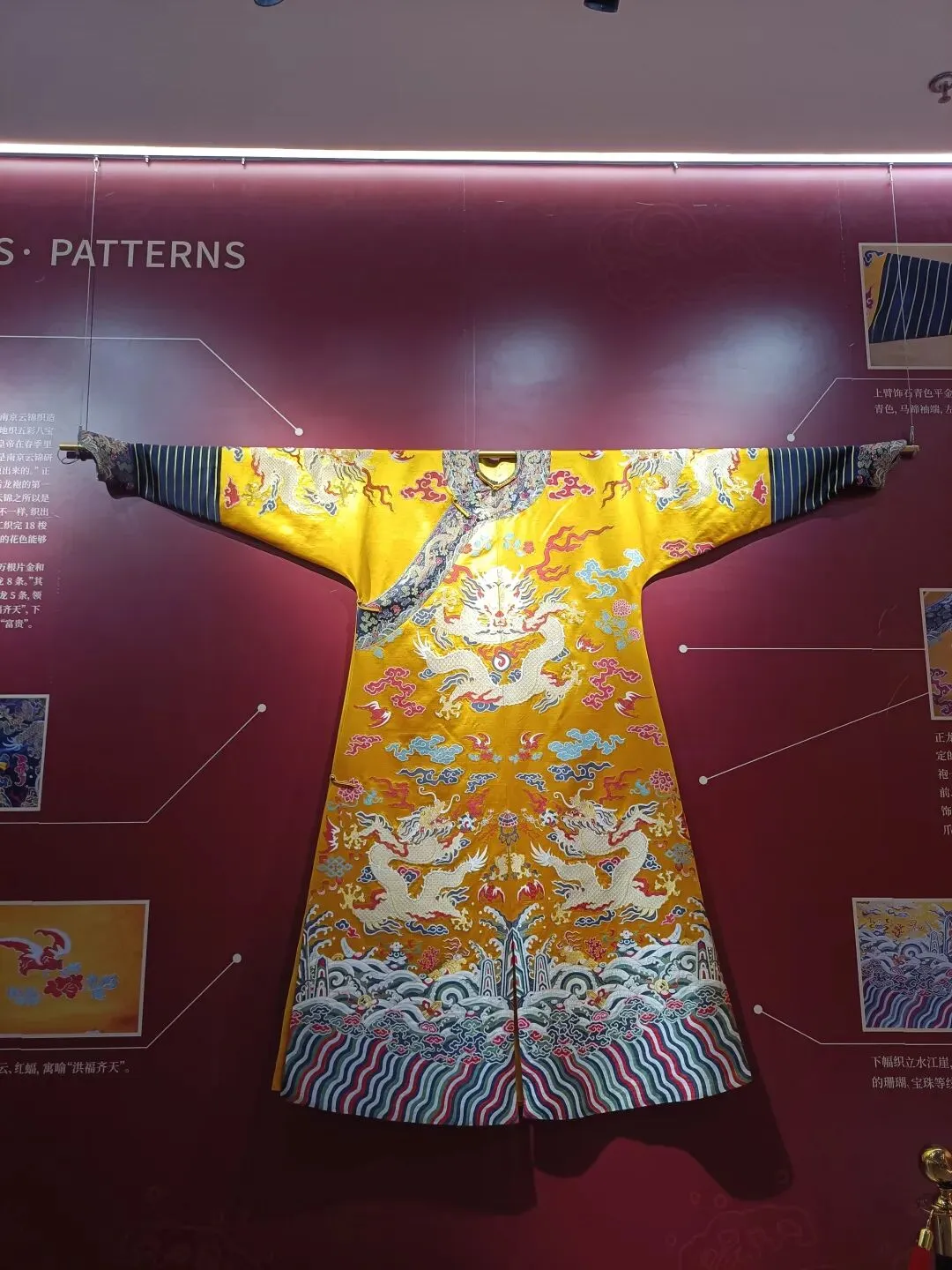 一楼主要是云锦文创与成品售卖区;二楼是正式展厅,陈列着历代丝织品、云锦纹样与各式织机模型。