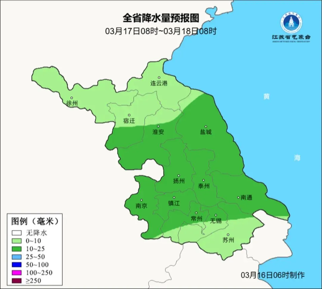 据江苏气象消息,3月16日08时至3月17日08时,沿江和苏南地区阴有小雨,局部雨量中等,淮北地区多云到阴,其他地区阴有小雨并渐止转多云到阴。今天最高温度:淮北和苏南南部地区12℃左右,其他地区10~11℃;明晨最低温度:本省东北部地区2~3℃,苏南地区8℃左右,其他地区5℃左右。全省偏东风4级左右。