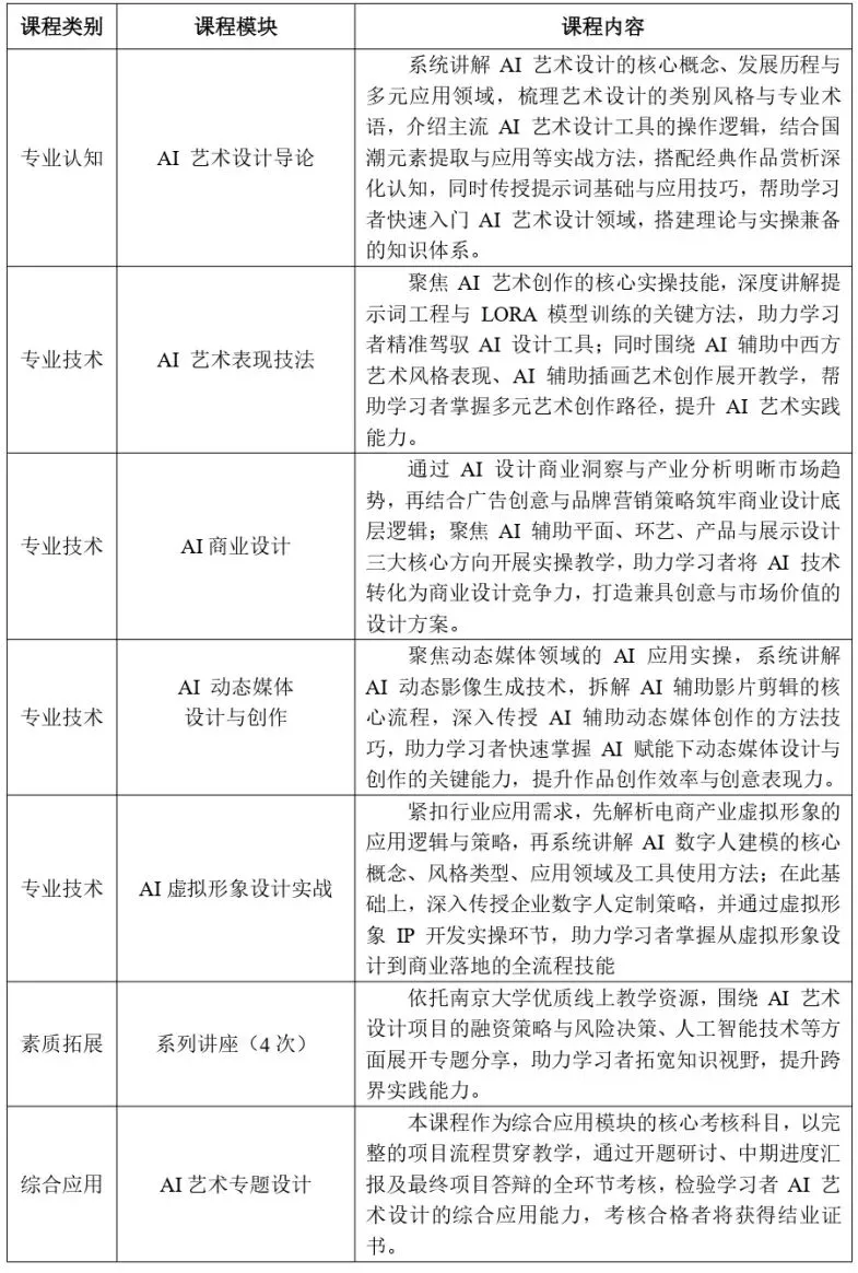 在AI技术与艺术创作深度融合、数字文创产业迅猛崛起的新时代,具备“AI工具+艺术思维”的复合型设计人才成为行业刚需。为精准对接市场需求,赋能艺术设计从业者与爱好者突破创作瓶颈、实现职业升级,南京大学终身教育学院依托百年学府的学术底蕴、顶尖师资与优质资源,特开设“艺术+”复合型技能专项培训班(AI艺术设计方向),以理论与实战双轮驱动,培育兼具创新视野与实操能力的新时代AI艺术设计人才。