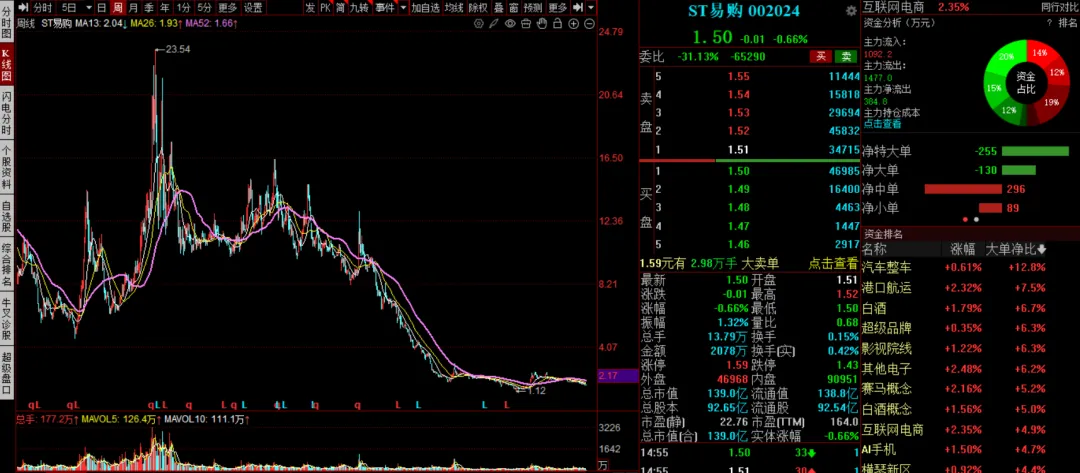 今日要讲的故事是ST易购(002024,原苏宁电器)自 2004 年上市至今,股价走势完整映射了公司从线下连锁王者到多元化扩张、再到债务危机、重整求生的全过程,整体呈现先暴涨、再震荡、后暴跌、低位徘徊的轨迹。