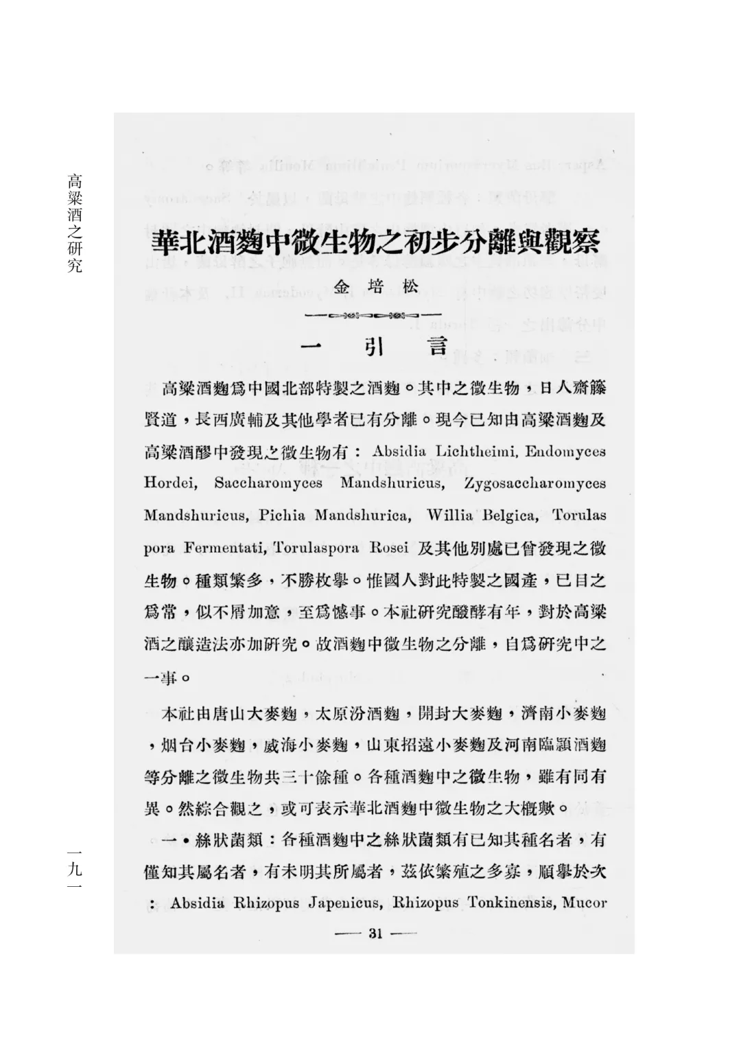 本所歷年分離鑒定及貯養之各種發酵微生物 金培松著 經濟部中央工業試驗所,一九四一年鉛印本