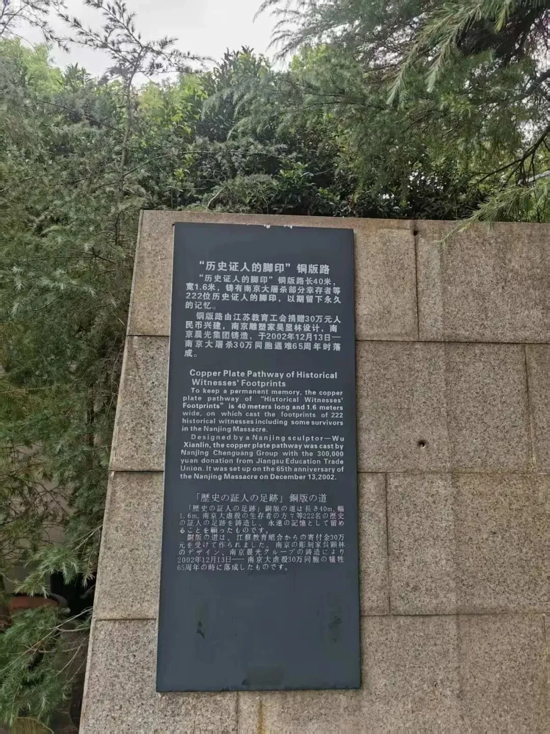 侵华日军南京大屠杀遇难同胞纪念馆悼念广场上的“历史证人的脚印”铜版路,是一条长40米、宽1.6米的青铜步道,于2002年12月13日落成,旨在永久铭记南京大屠杀历史。