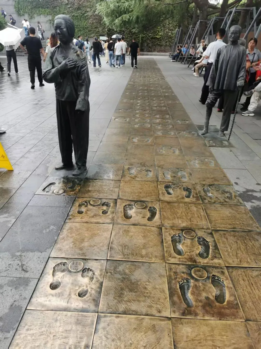 象征意义与背景: 铜版路象征历史证人的集体记忆与证言,脚印或深或浅、或大或小,代表证人亲历的苦难与坚韧,路径直通纪念墙上“遇难者300000”字体中央,强化警示后人勿忘历史的寓意;路旁矗立着幸存者倪翠萍和彭玉珍的铜像,她们分别于9岁和20岁时遭受日军枪击,成为历史见证的具象化代表。