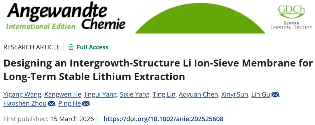 Designing an Intergrowth‐Structure Li Ion‐Sieve Membrane for Long‐Term Stable Lithium Extraction. Yigang Wang;Kangwen He;Jingui Yang;Sixie Yang;Ting Lin;Aoyuan Chen;Xinyi Sun;Lin Gu;Haoshen Zhou;Ping He. ISSN: 1433-7851 , 1521-3773; DOI: 10.1002/anie.202525608. Angewandte Chemie. , 2026.
