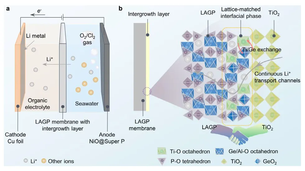 (a) 展示了从海水中电化学提取金属锂的装置示意图。在外加电源作用下,阳极发生析氧或析氯反应,Li⁺选择性透过锂离子筛膜迁移至有机电解液,并在阴极还原为锂金属。(b) 对比了传统涂层与本研究提出的共生层结构。传统涂层与LAGP基底之间存在明显界面,而通过渗透生长策略形成的TiO₂共生层,通过晶格匹配的LATP界面相与LAGP膜紧密结合,构建了连续的Li⁺传输通道,避免了界面间隙的产生。