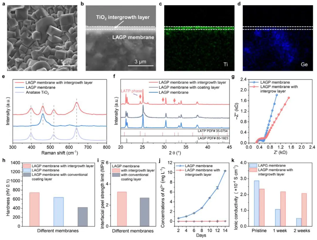 (a) 原始未抛光LAGP膜的SEM图像。(b) 共生结构膜的截面SEM图,显示致密的TiO₂层与LAGP基底之间无间隙。(c, d) 对应的EDS面分布图,证实了Ti元素在表层的均匀分布及Ge元素在基底的存在。(e) 拉曼光谱同时检测到TiO₂(400, 519, 640 cm⁻¹)和LAGP(470 cm⁻¹)的特征峰,证明两相共存。(f) XRD面分布图显示,仅在共生结构膜中检测到LATP相的衍射峰,表明形成了晶格匹配的界面相。(g) 电化学阻抗谱显示,共生结构膜(三次旋涂)的离子电导率(2.4×10⁻⁴ S cm⁻¹)相较于原始LAGP膜未显著增加。(h, i) 机械性能测试表明,共生结构膜的硬度(744.2 HV0.1)和界面剥离强度(>3.25 MPa)均优于原始膜或传统涂层膜。(j) 海水中Al³⁺溶出浓度监测显示,共生结构膜能有效抑制LAGP的溶解。(k) 两周海水浸泡后的离子电导率变化表明,共生结构膜的稳定性远优于原始LAGP膜。