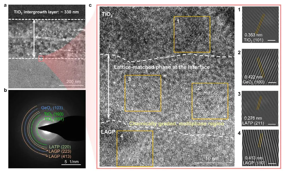 (a) 界面区域的TEM图像,TiO₂共生层厚度约为330 nm。(b) 对应的选区电子衍射图,揭示了界面处LATP相的存在。(c) 对应于图(a)中红色区域的高分辨TEM图像,测量到的晶格条纹分别对应TiO₂(101)面(0.353 nm)、LAGP(110)面(0.413 nm)、LATP相及GeO₂。结果表明,TiO₂层与LAGP膜之间的界面是一个包含晶格匹配LATP相的化学梯度多相区,确保了界面结合和离子传输。