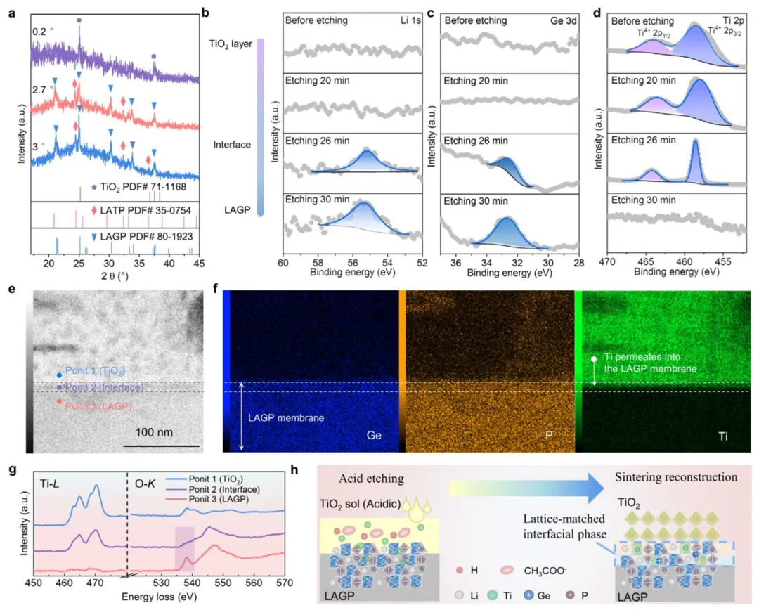 (a) 不同掠射角下的GIXRD图谱显示,随着角度增大(探测深度增加),LATP的衍射峰出现,证实了其位于界面过渡区。(b-d) XPS深度剖析显示,在蚀刻初期主要检测到Ti和O的信号(来自TiO₂层),蚀刻26分钟时同时检测到Ti、Ge、Al、P等元素,证实了界面过渡区的存在。(e, f) 界面区的TEM及EDS面分布图清晰地展示了Ti元素从表层向LAGP内部的渗透现象(两条白线之间为过渡区)。(g) 对应图(e)中点1-3的EELS线扫,显示Ti信号逐渐减弱,而O-K谱图表明界面处存在氧空位,有利于Li⁺传输。(h) 示意图总结了界面相的形成过程:乙酸刻蚀→Ti⁴⁺/Ge⁴⁺离子交换→晶格匹配的LATP界面相生成。