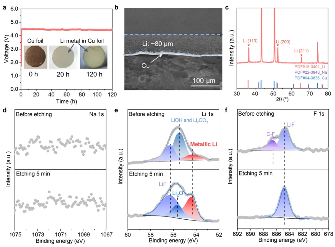 (a) 恒流(100 μA cm⁻²)提锂过程中的电压曲线,插图显示不同时间后铜箔上的沉积产物。(b) 提锂120小时后沉积层的截面SEM图,厚度约为80 μm。(c) 沉积产物的XRD图谱,主要显示Cu基底和Li⁰的衍射峰,无Na⁰峰。(d-f) 沉积产物的XPS深度剖析光谱。在蚀刻前,主要检测到Li₂CO₃/LiOH和LiF等SEI组分;蚀刻600秒后,Li⁰峰(54.3 eV)成为主导,证明内层主要为金属锂。ICP-OES分析证实沉积物中Li是唯一金属成分,且Li来源于海水而非有机电解液。