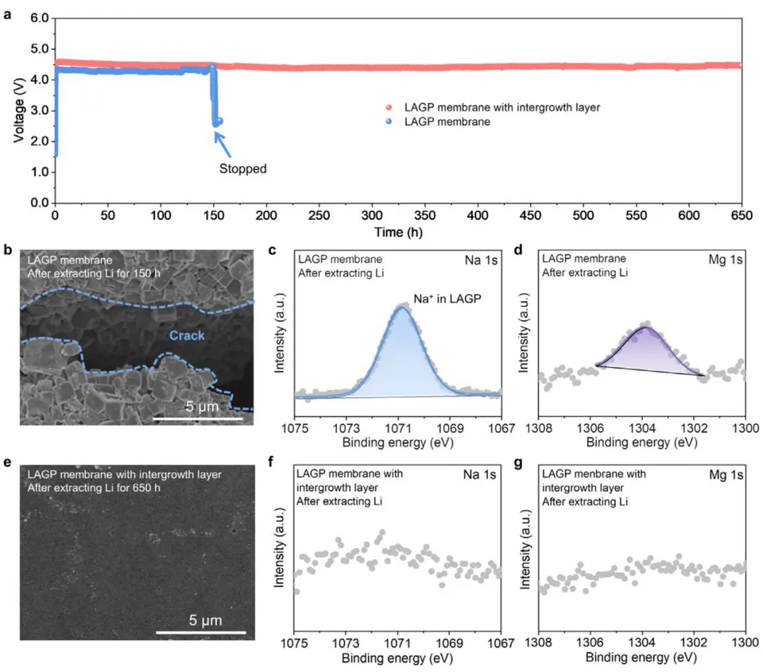 (a) 采用两种膜进行恒流(100 μA cm⁻²)提锂的电压-时间曲线。原始LAGP膜在约150小时后电压骤降,宣告失效;而共生结构膜在650小时内保持稳定运行。(b, e) 提锂后膜表面的SEM图,原始LAGP膜表面出现裂纹,共生结构膜表面保持平整。(c, d, f, g) 提锂后膜的XPS光谱。原始LAGP膜表面检测到明显的Na 1s和Mg 1s信号,表明发生了严重的离子交换腐蚀;而共生结构膜表面未检测到这些信号,证明TiO₂共生层有效隔绝了海水,保护了LAGP基底。