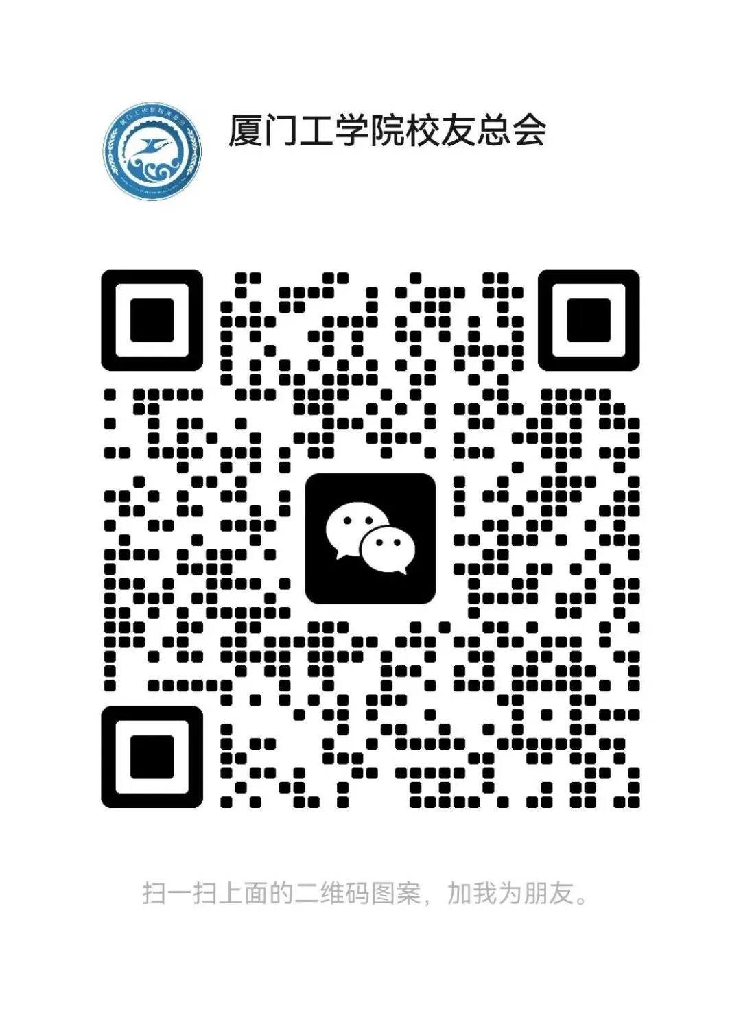 快动动您的手指添加厦门工学院校友总会微信号,厦门工学院校友总会拉您入群哦,我们期待您的到来!扫一扫上面的二维码图案,加我为朋友。