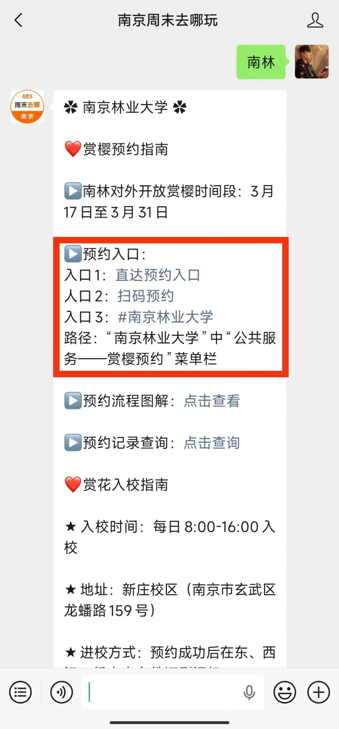 若是想获取快捷预约入口,也可以扫描下方二维码,关注【南京周末去哪玩】公众号,私信回复【南林】就可以获取快捷预约入口