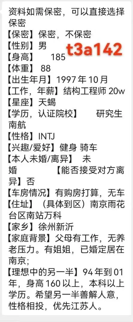 这是一个浮躁的时代,也是一个认识人成本极低的时代,无效的人和事占据太多的时间,骗子、约炮、理财销售等等让我们产生焦虑、内耗,为了帮助大家节约时间,相亲宝公众号发帖人不公布联系方式,我们红娘负责过滤一些不靠谱的人,专门进行验证核实。提示大家:相亲急切的心情可以理解,但相亲过程中不要有任何金钱往来,切记切记。精准一对一推荐介绍,唯一线下门店地址:秦淮区大行宫长安国际2307。