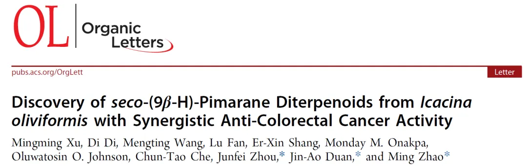 2026年3月,南京中医药大学赵明教授团队在期刊《Organic letters》(IF:5.0)在线发表题为:Discovery of seco-(9β-H)-Pimarane Diterpenoids from Icacina oliviformis with Synergistic Anti-Colorectal Cancer Activity 的高水平研究论文。