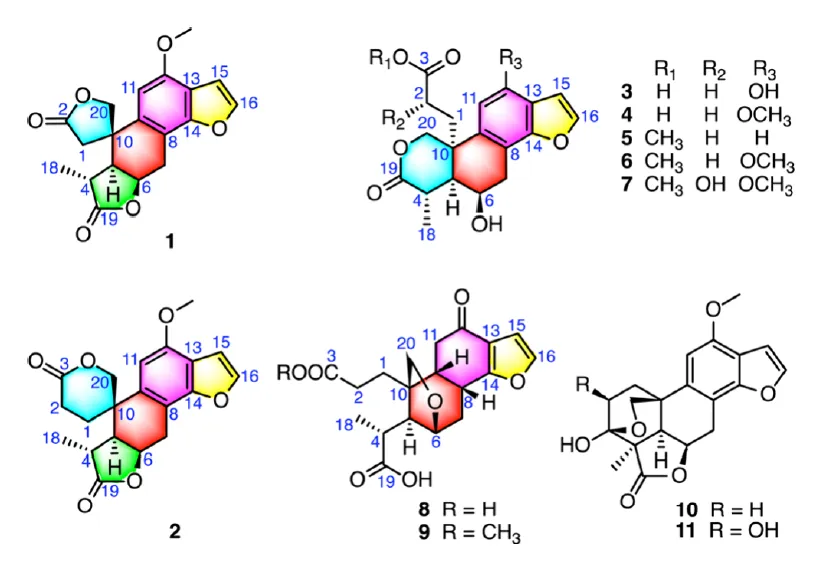化合物1是首个天然3,17-二去甲基比马兰类,具有新型2-氧螺[4.5]癸-3-酮核心,与γ-丁内酯和苯并呋喃单元融合。化合物2-9定义了一类新的天然3,4-开环-17-去甲基比马兰类结构亚类。