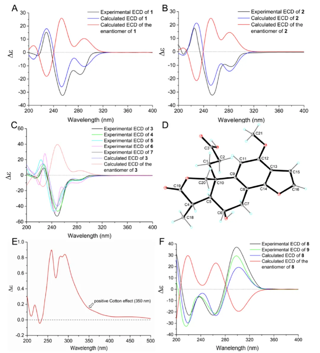 Figure 2通过实验与计算ECD光谱对比、单晶X射线衍射以及Rh2(OCOCF3)4诱导ECD方法,确定了化合物1-9的绝对构型。图A-C显示化合物1-3的实验ECD与计算ECD吻合良好;图D为化合物4的X射线ORTEP图;图E展示化合物7的诱导圆二色谱在350 nm处呈正Cotton效应;图F证实化合物8和9具有相同的绝对构型(4R,5S,6R,8R,9R,10S)。