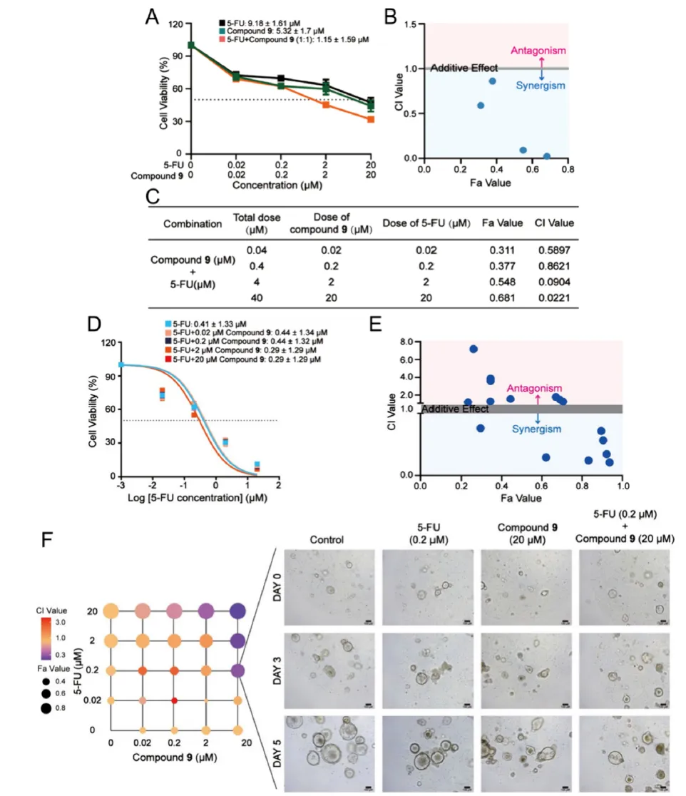 在多细胞系筛选中,化合物9对HT-29(IC50=5.32 μM)和SW620(IC50=9.92 μM)细胞显示出优于5-氟尿嘧啶(5-FU)的效力和选择性。此外,它与5-FU在HT-29细胞(CI=0.0904)和结直肠癌患者来源类器官(CI=0.2903)中表现出强烈协同作用,提示5-FU具有显著的剂量减量潜力。