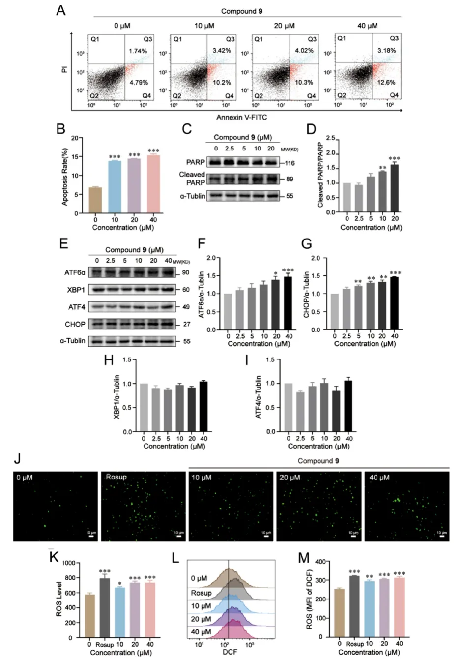 5. 首次阐明化合物9通过ROS驱动的ATF6-CHOP内质网应激通路诱导肿瘤细胞凋亡的作用机制,为克服结直肠癌化疗耐药提供了新靶点。