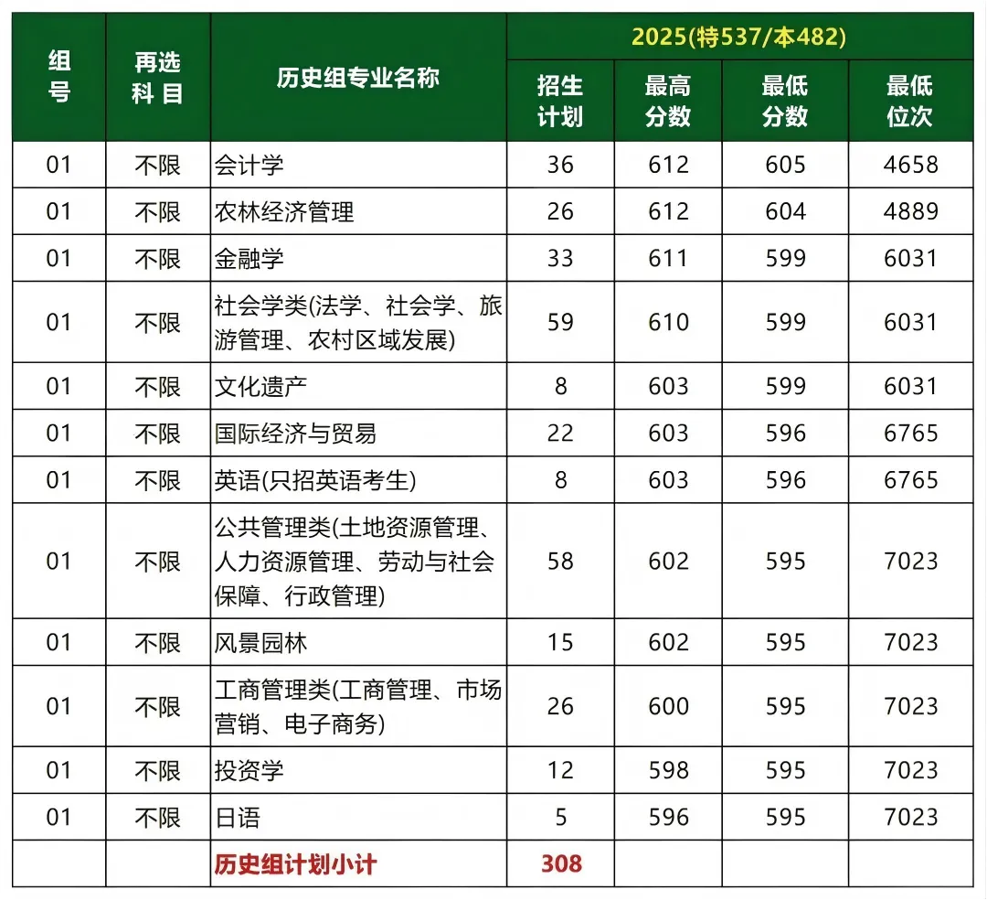 首选历史,分数最高的专业是会计学、农林经济管理,分数是612分。