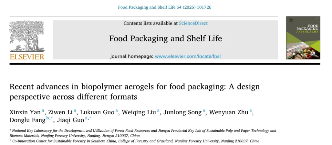 ●近日,南京林业大学郭家奇教授(通讯作者)在食品科学领域国际著名期刊《Food Packaging and Shelf Life》(IF=10.6,中科院1区Top期刊)发表题为“Recent advances in biopolymer aerogels for food packaging: A design perspective across different formats”的综述论文。南京林业大学轻工与食品学院博士生燕鑫鑫为论文第一作者。该论文系统梳理了生物质基气凝胶在食品包装领域的研究进展,并从实际包装应用形式出发,对其结构设计、功能实现及应用潜力进行系统总结。