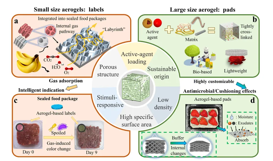 该研究旨在系统梳理生物质基气凝胶在食品包装领域的最新研究进展,并从实际包装应用形式出发,对其设计思路和功能实现机制进行总结与分析。研究将气凝胶在食品包装中的应用划分为两类典型形式:一类为小尺寸气凝胶标签,主要用于气体吸附、湿度调控以及新鲜度指示等功能;另一类为较大尺寸的气凝胶垫片或缓冲结构,可用于吸附食品渗出液、缓释抗菌或抗氧化活性物质,并在运输和储存过程中提供机械缓冲与保护。文章进一步总结了纤维素、淀粉、壳聚糖及蛋白质等多种生物质材料构建气凝胶结构的研究进展,并分析了气凝胶微观结构、孔隙结构与包装功能之间的关系。研究指出,生物质基气凝胶凭借其超轻质、高比表面积和高度可调的多孔结构,在气体调控、湿度管理、活性释放以及智能监测等方面展现出良好的应用潜力,但在规模化制备成本、湿态稳定性以及食品接触安全等方面仍面临一定挑战。该综述从包装应用场景出发,对生物质基气凝胶在新一代智能与活性食品包装中的发展方向和应用前景进行了系统总结。