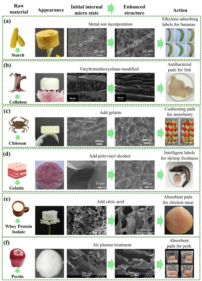 来自不同生物质来源的代表性生物质气凝胶,显示了原料来源、气凝胶外观、初始和增强的微观结构以及相应的食品包装应用