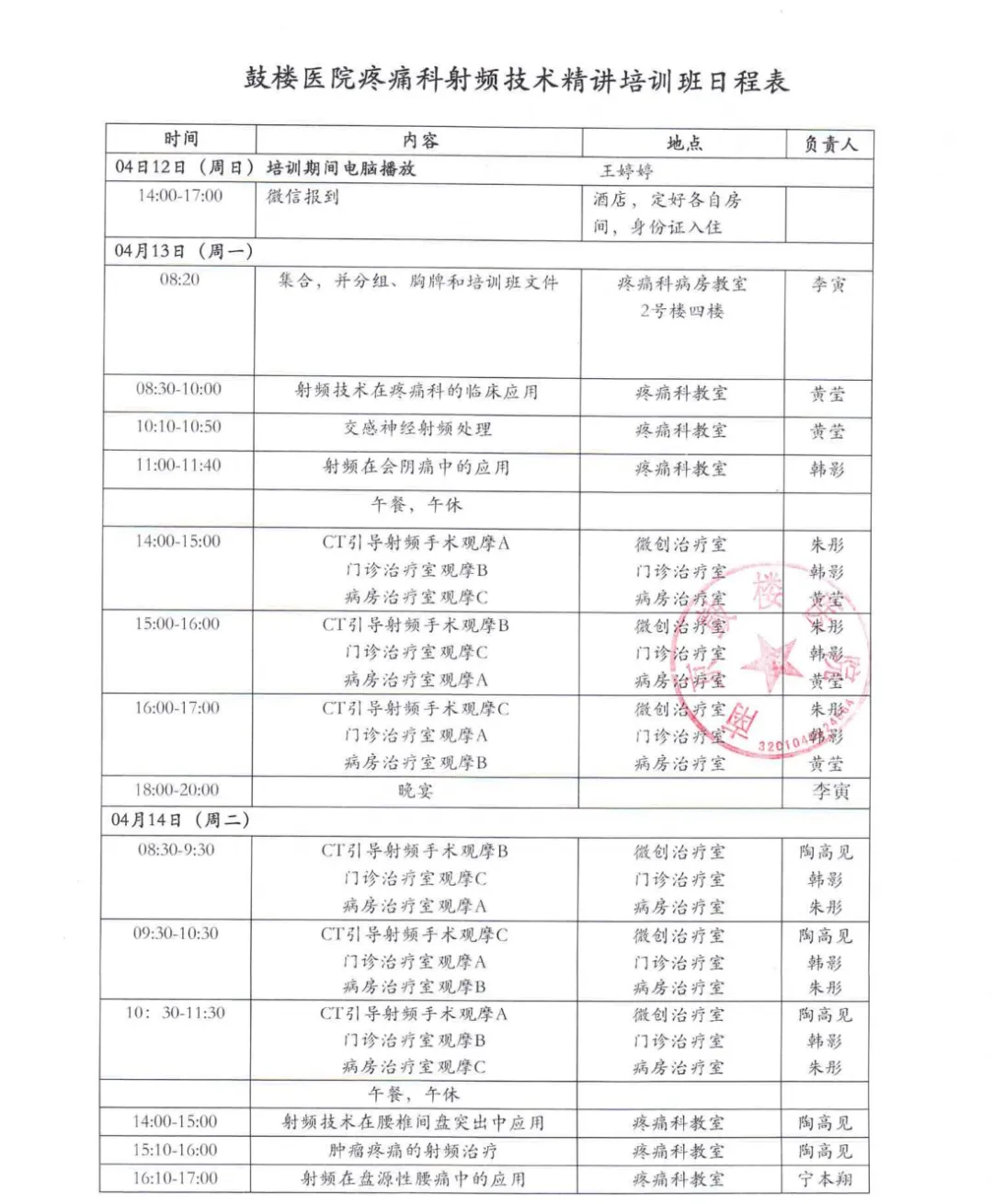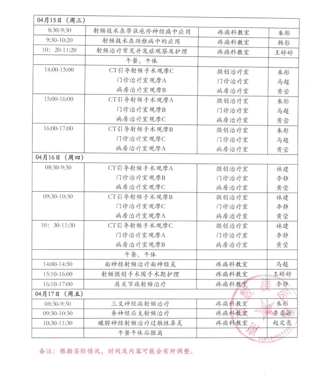 位疼痛及相关专业同仁:南京鼓楼医院疼痛科已开展多次射频学习班,近期拟继续开展射频技术学习班,培训射频技术。本期“射频技术在疼痛科的应用”培训班招生对象为专科联盟内外具有中级职称以上的疼痛科医生。主办单位:南京鼓楼医院培训时间:2026年4月13日-17日学费:5000元/人,专科联盟单位3000元/人,基层孵化单位2000元/人。联系人:张老师 18513068596 报名者请注明:姓名、性别、单位名称、职称、电话,住宿与否;已开展射频微创手术台次(0,10,50,100或>100)食宿费用自理:提供医院附近“名人城市酒店”供学员参考,380元/间,含早餐。培训期间备午餐。