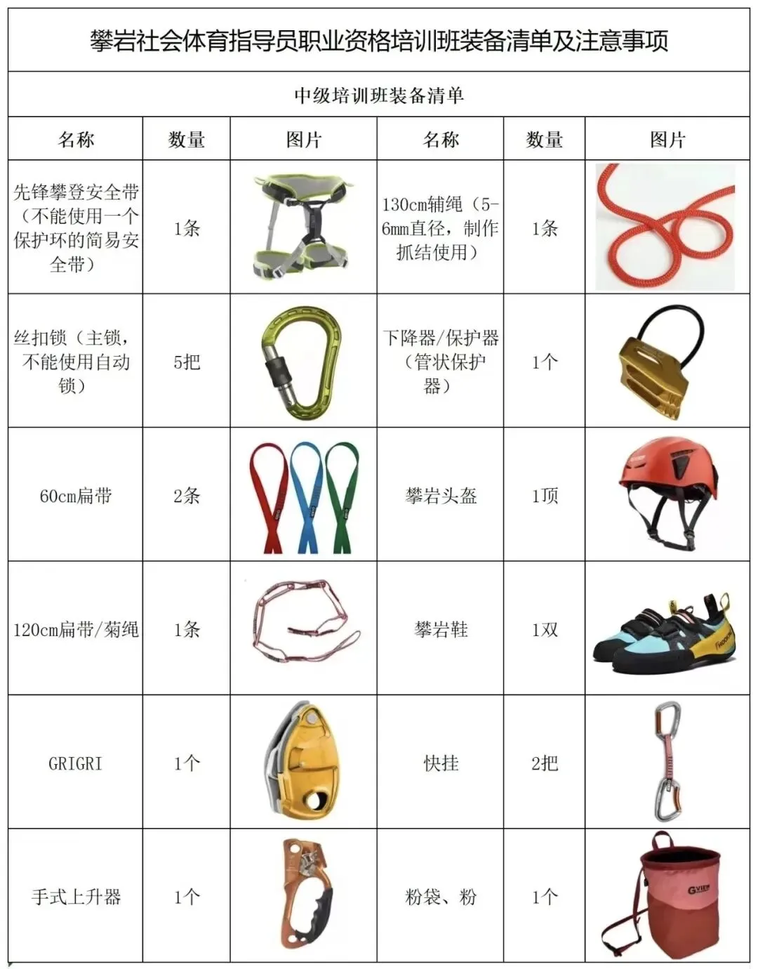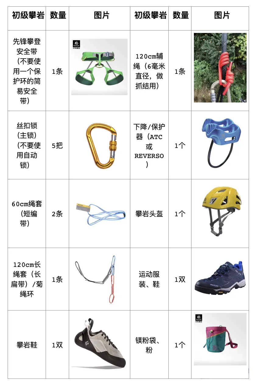4、请培训学员自备个人技术装备,其攀岩装备须符合GB标准或UIAA、CE标准。