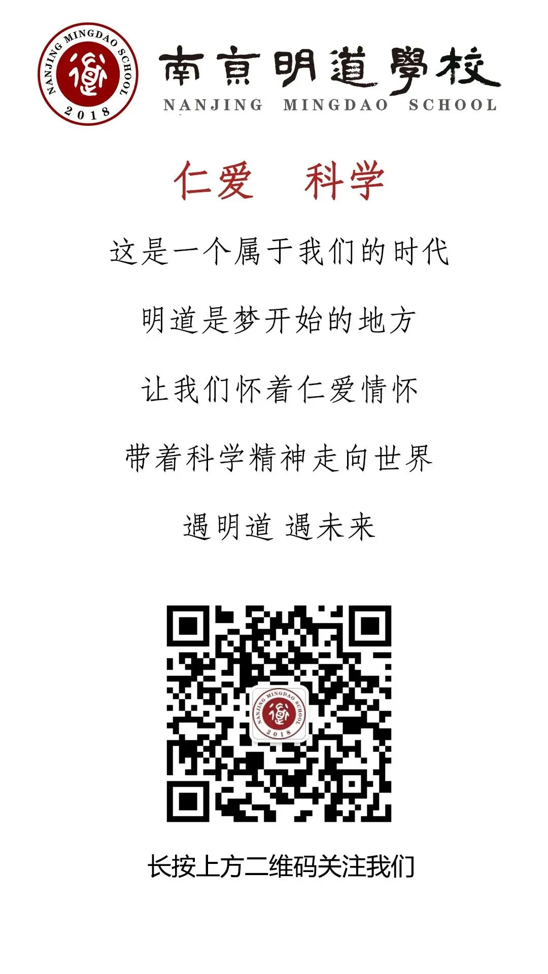 明道八年,岁在丙午,初春之时,卓立江左老山,俯望明道雅园,共襄纳贤盛举也。群贤毕至,少长咸集。此地有仁爱情怀,科学精神。高拱极目,碧水映天,又有宽敞学舍,映带左右,引青春少年,列坐其中。虽无雕龙画凤,然琅琅书声,足以畅享育人真情。巍巍书楼,闳敞轩昂,可仰观宇宙之大,俯察品类之盛,所以游目骋怀,足以极阅读之娱,信可乐也。