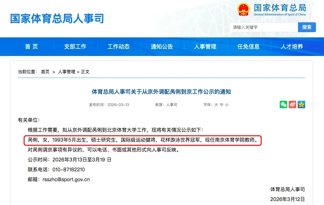 近日,国家体育总局人事司发布关于从京外调配呙俐到京工作公示的通知。
