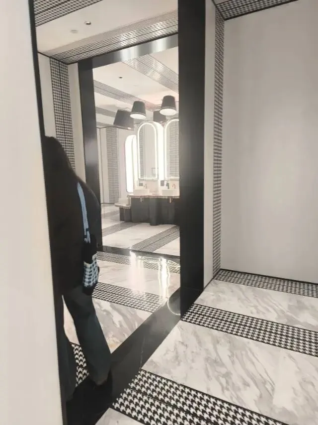 从门口进去是一条长长的通道,两边有软软的坐位,然后转角有一个台阶,在台阶上面对面分别写着男女卫生间,进入女卫生间,一眼看到的是几把椅子,椅子前面有镜子,像是让人化妆的地方,然后再继续走,就是一扇扇门,面盆的水都是热的,惊讶这卫生间太高档了,难怪常常有人来打卡,每一层的卫生间都是不同风格,这一次简单地逛,偷偷拍了几张照片。