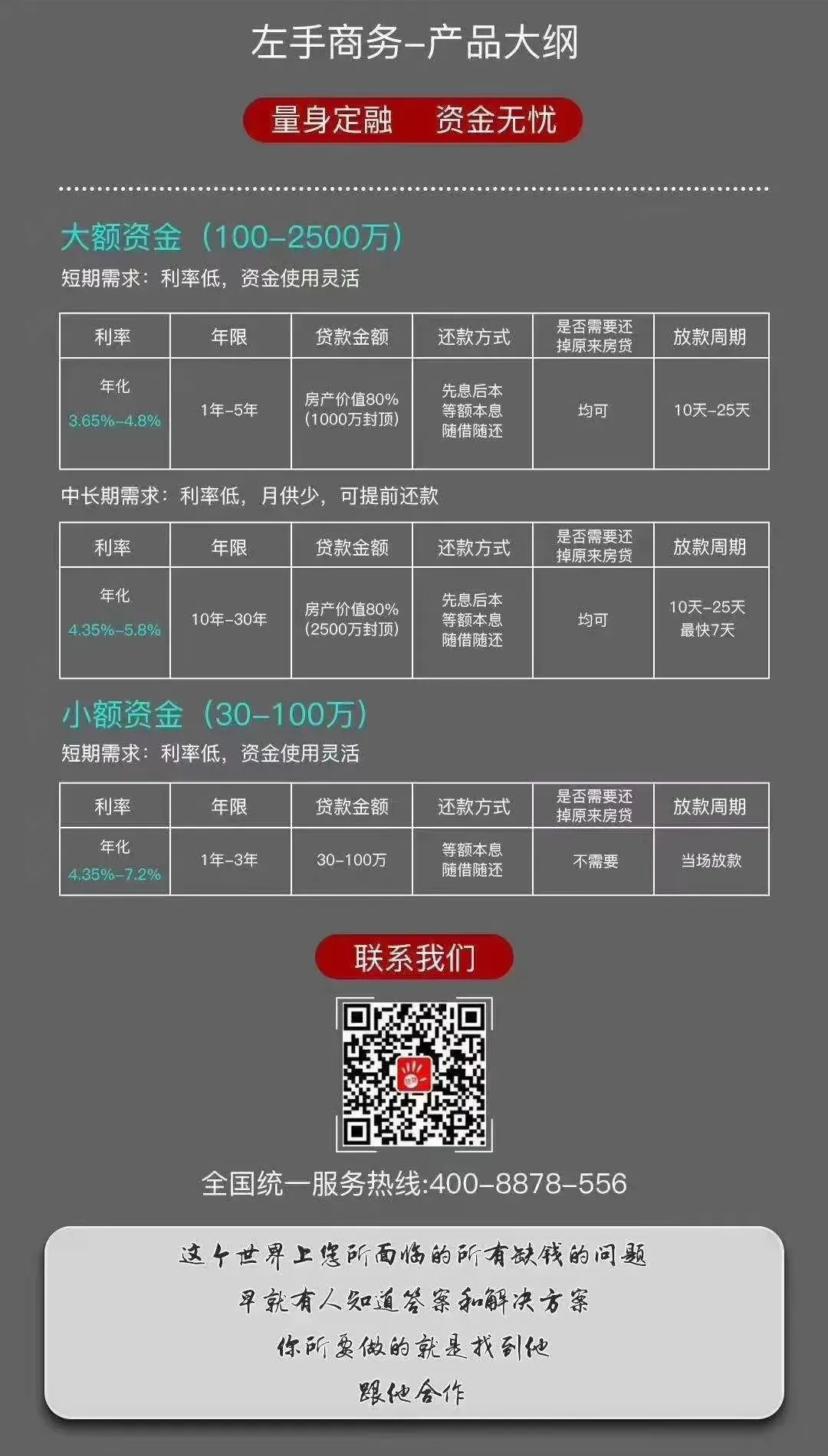 一站式服务:从方案设计、材料准备到放款跟进,36小时快速落地- 本公众号发布的所有内容,包括但不限于文字、图片、音频、视频、图表、标志、标识、广告、商标、商号、域名、软件、程序等,除特别标明外,均来源于网络,版权归原作者或原出处所有。我们致力于保护原作者版权,若涉及版权问题,请及时联系我们进行处理。