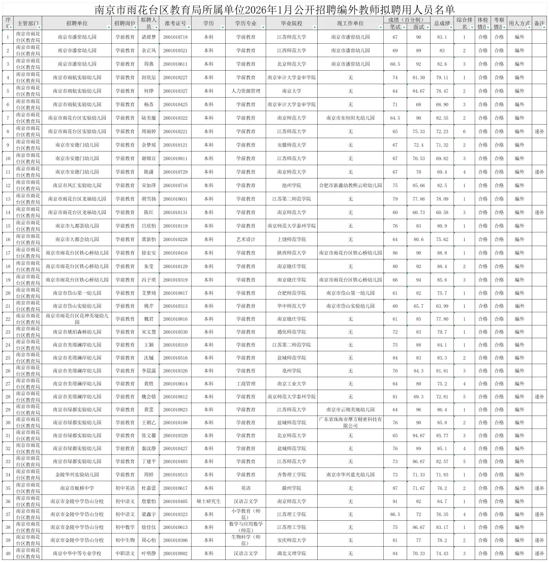 根据《南京市雨花台区教育局所属单位2026年1月公开招聘编外教师公告》,经过笔试、面试、体检、考察等程序,现将南京市雨花台区教育局所属单位2026年1月公开招聘编外教师拟聘用人员名单进行公示。公示期为7个工作日,自2026年3月16日至2026年3月24日。对公示名单如有异议,请于公示期内进行反映。