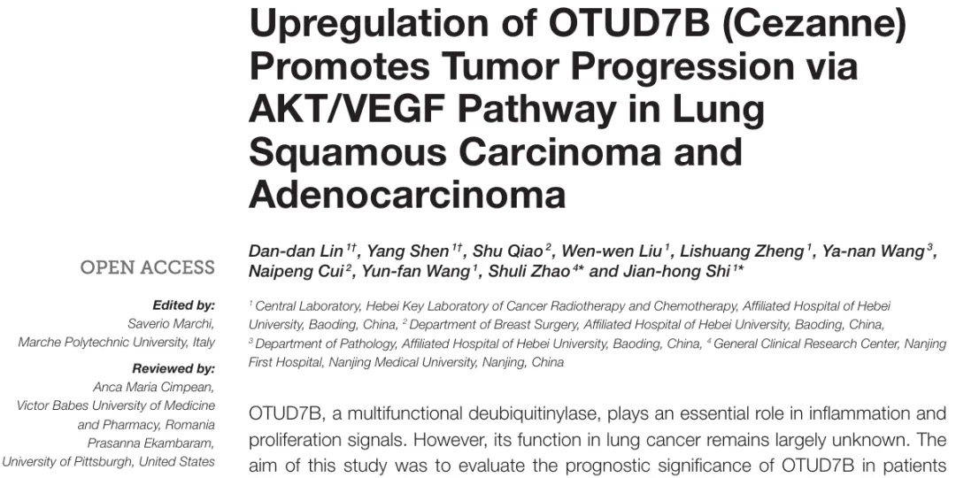 的一篇标题为 Upregulation of OTUD7B (Cezanne) Promotes Tumor Progression via AKT/VEGF Pathway in Lung Squamous Carcinoma and Adenocarcinoma 的研究论文被 PubPeer 用户质疑存在图像问题。