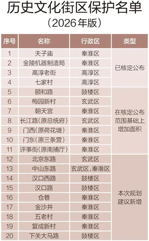 此前,南京市已核定公布4片历史文化街区(夫子庙、金陵机器制造局、高淳老街、七家村)。在此基础上,将颐和路、梅园新村、朝天宫、长江路(原总统府)、门西(原荷花塘)、门东(原三条营)、评事街(原南捕厅)等7片在核定公布范围基础上扩大面积或正式纳入街区范畴。本次《规划》建议新增北京东路、中山东路、汉口西路、汉口路、仓巷、金沙井、五老村、复成新村、下关大马路等9片历史文化街区。这些新增街区涵盖从近现代教育科研建筑群、民国官邸住宅区到传统民居街巷、近代工业遗存等多种类型,极大地丰富了南京作为“中西交融、承古启今”建筑风貌代表地的内涵。