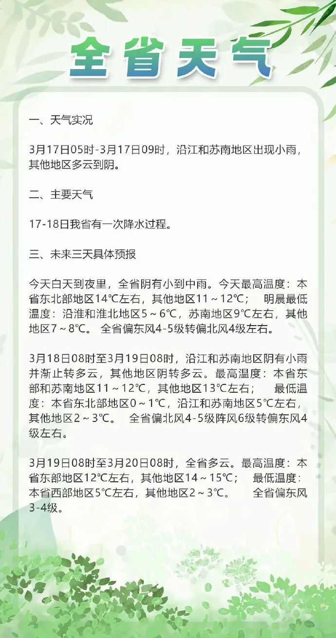 据江苏气象最新消息,今天白天到夜里,全省阴有小到中雨。今天最高温度:本省东北部地区14℃左右,其他地区11~12℃; 明晨最低温度:沿淮和淮北地区5~6℃,苏南地区9℃左右,其他地区7~8℃。 全省偏东风4-5级转偏北风4级左右。