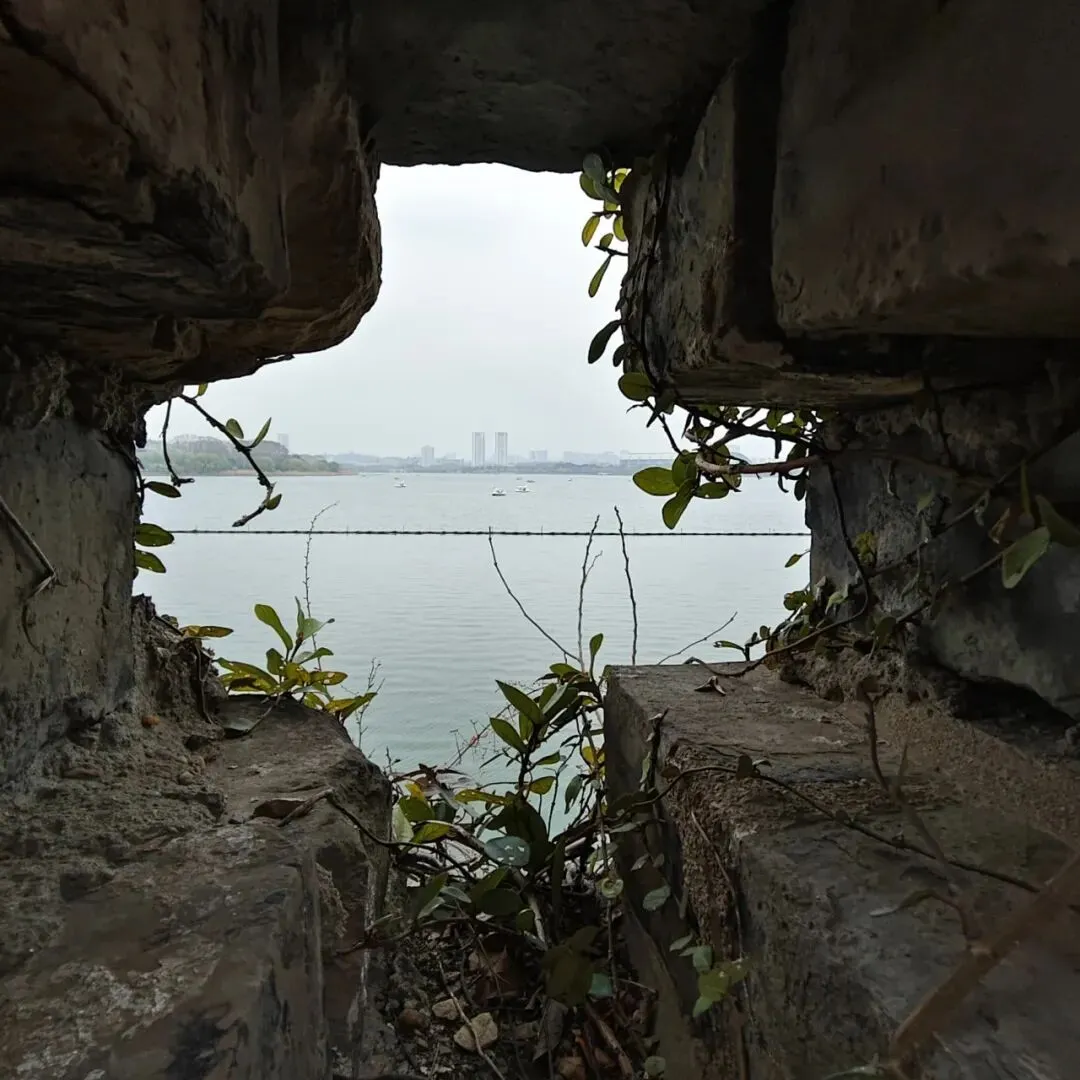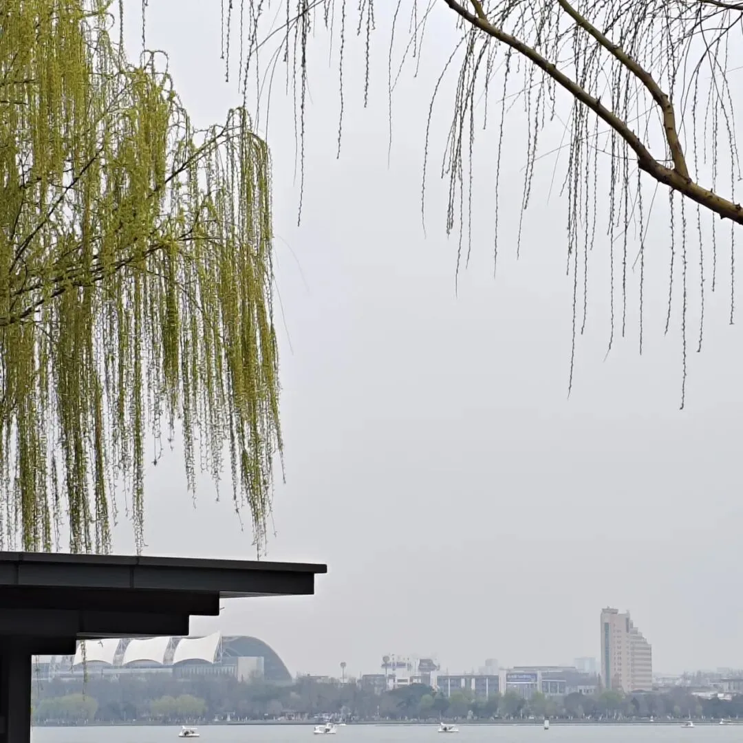 透过湖旁边墙上的凹槽看南京,雾蒙蒙看不太清