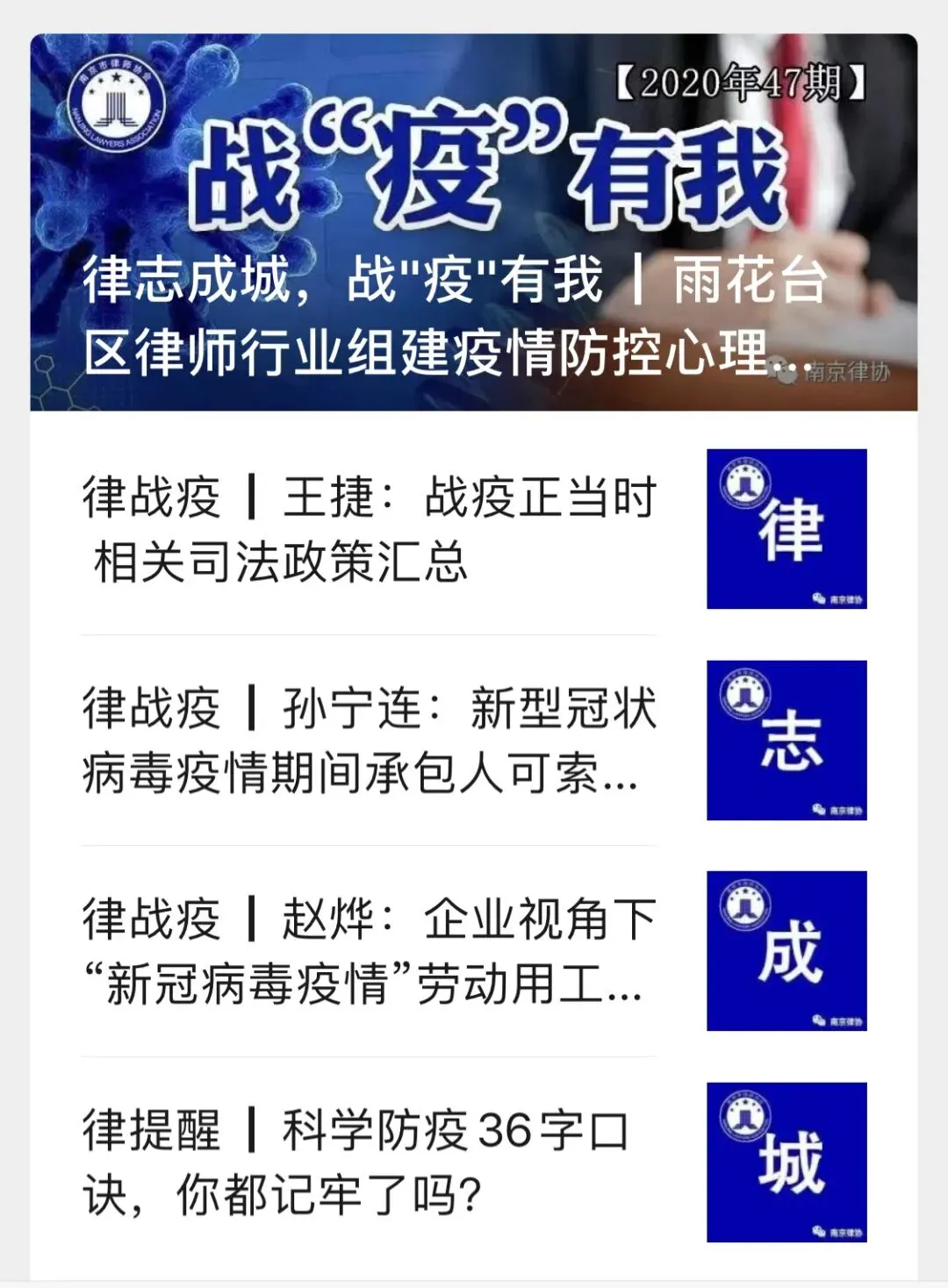 疫情暴发以来,南京律协一方面积极组织广大律师捐款捐物,研讨相关法律问题,支持依法抗疫;另一方面,主动作为,协调规范支持律师依法执业,在做好防护的前提下,有序复工。