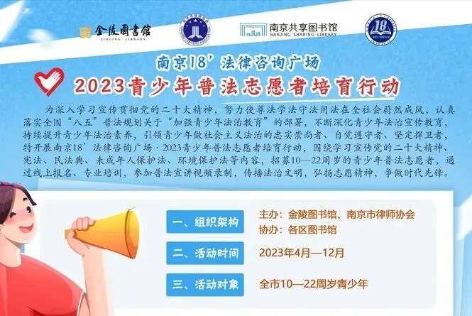 2024年1月起,普法宣讲视频(包括《宪法》《民法典》《未成年人保护法》《道路交通安全法》《环境保护法》《野生动物保护法》《著作权法》《道路交通安全法实施条例》等)在金陵图书馆、南京市律师协会、各区图书馆相关活动及新媒体平台进行展播。