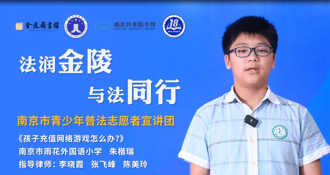 法润金陵,与法同行。大家好,我是南京市青少年普法志愿者宣讲团成员,来自南京市雨花外国语小学的朱楷瑞。我宣讲的题目是《孩子充值网络游戏怎么办?》。