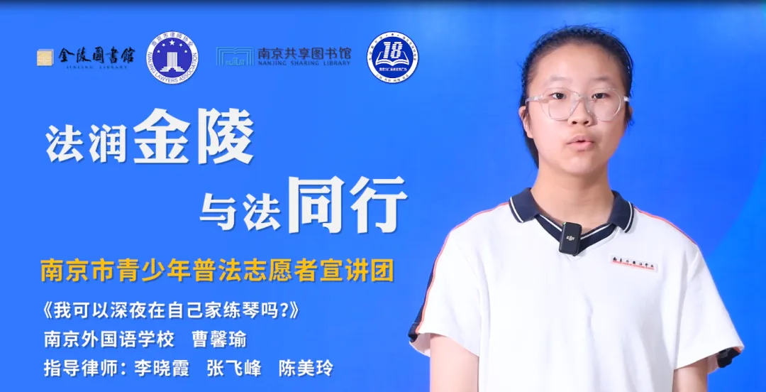 法润金陵,与法同行。大家好,我是南京市青少年普法志愿者宣讲团成员,来自南京外国语学校的曹馨瑜。我宣讲的题目是《我可以深夜在自己家练琴吗?》。