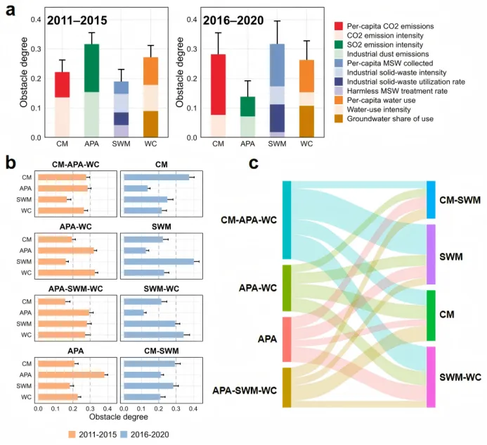 城市层面的聚类结果表明,前期城市主导障碍主要集中于大气污染,后期则整体转向固废管理、碳减排及其复合约束。此外,不同城市的转型路径也存在明显差异:例如,深圳和杭州早期主要受空气污染与水资源等复合因素制约,后期逐渐聚焦到固体废物管理这一核心问题。上海和广州则呈现另一种变化:随着空气和水资源压力缓解,碳减排任务依然存在,同时固废问题愈发突出,体现出“老问题减轻,新问题凸显”的转型节奏。唐山和成都的情况不同,水资源压力在后期依然明显,再加上固废风险上升,两者叠加形成持续性的复合压力。而兰州、鞍山等西北和东北城市,在传统污染问题得到控制后,碳相关约束逐渐成为治理重点,反映出治理重心正从常规污染控制向低碳转型过渡。