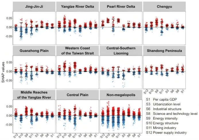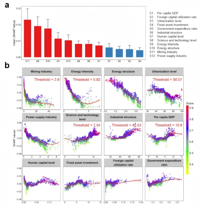 社会经济驱动机制分析:选取反映城市发展、能源结构和污染型产业特征的12项社会经济变量,构建随机森林模型分析其对协同治理水平的影响,并结合SHAP方法识别关键驱动因素、解释变量作用方向及其非线性特征;同时,采用分段线性回归进一步检验阈值效应,以揭示不同因素在不同水平下的边际影响变化。