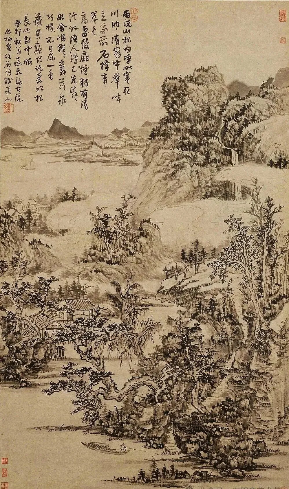 现藏故宫博物院,是其巅峰之作。画面层峦叠嶂,深谷流泉,林木葱郁,云烟流转。一条小径隐于山间,点缀隐士身影,笔墨苍润,意境幽深,尽显牛首山的壮阔与静谧。