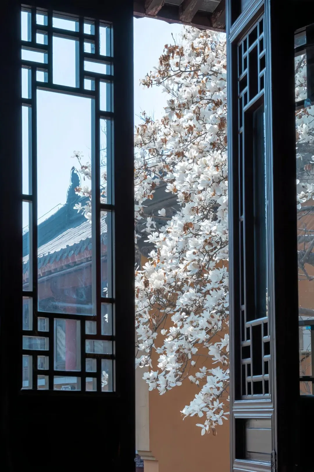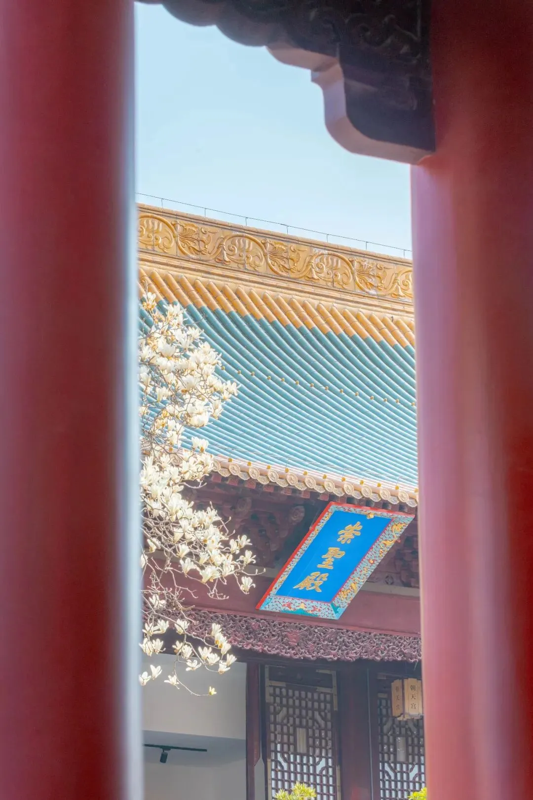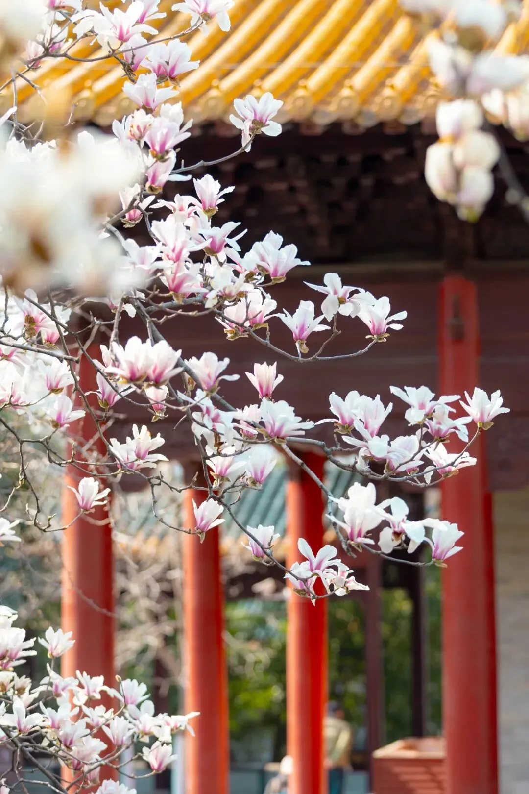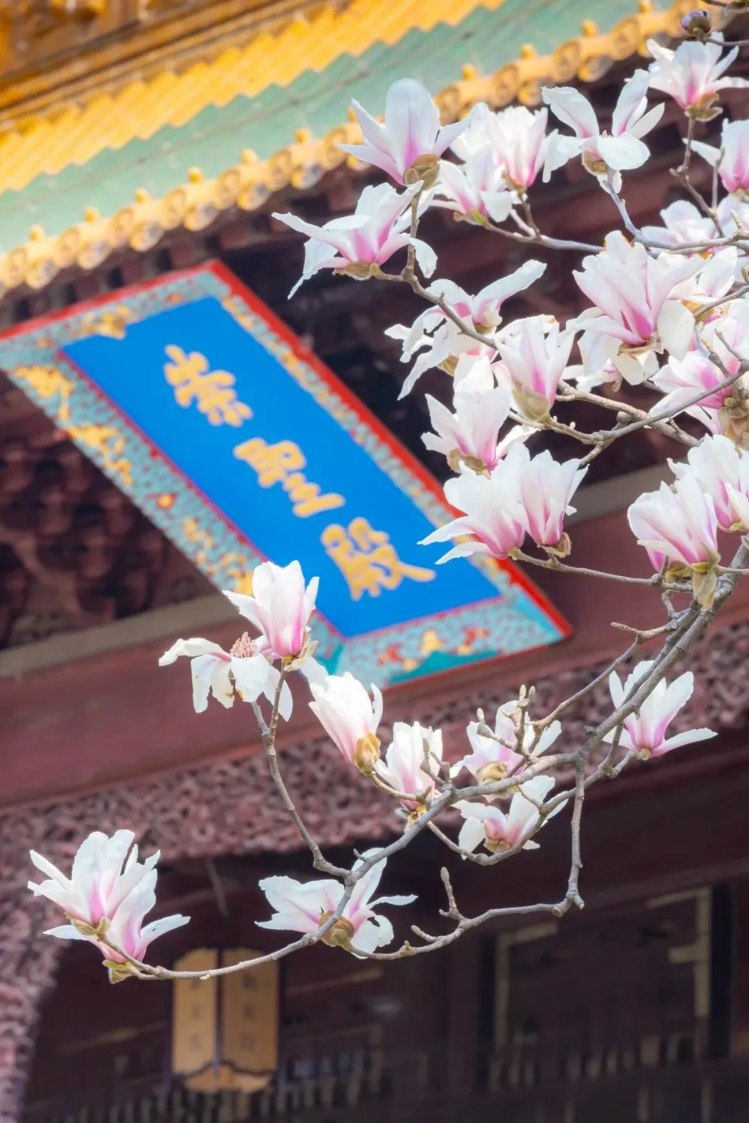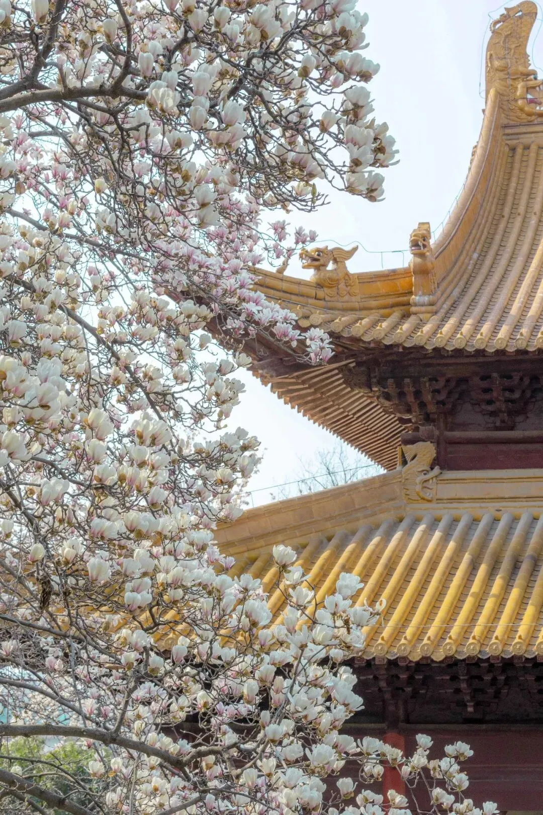 三月的南京,风里都带着软意,寻遍城隅,最耐看的,还是那几株立在古建筑旁的玉兰。玉兰花本是寻常花木,可往朱墙黄瓦、古刹书斋边一站,便沾了几分雅气,有了不同的模样。朝天宫|朱墙映雪,皇家气韵。红墙、黄瓦、白花,色彩对比强烈。