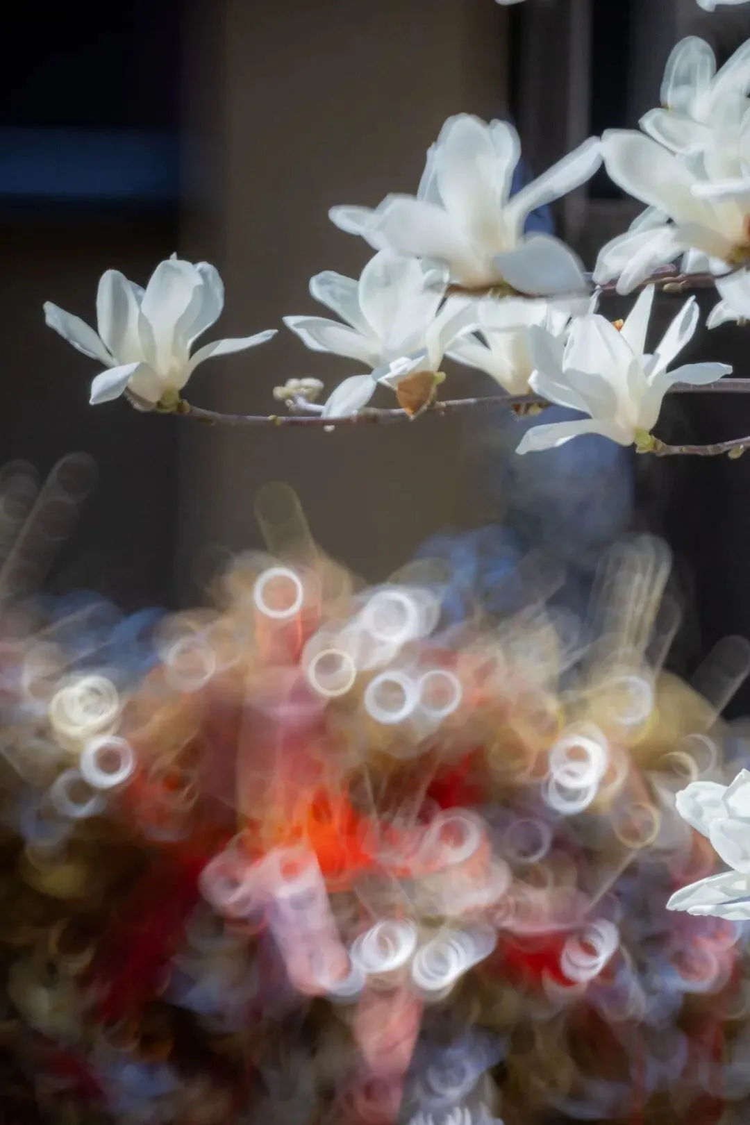 (大图在文末)这处的玉兰,我也拍了两回。九号上午用长焦,十三号中午换了折返镜头。折返镜头有意思,拍出来的玉兰,总带着点空灵神秘的劲儿,我还试着用二次曝光拍特写,想衬出古寺的静。可惜十三号中午风大,花枝摇摇晃晃,多重曝光的效果,终究是差了点意思,也算个小小的遗憾。